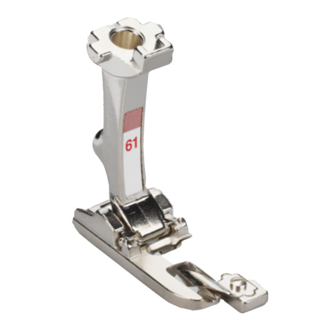 When working with Zigzag hemmer #61 the fabric is fed into a scroll, which turns the edge under twice. This prevents the fabric from fraying later. The guide holds together the turned hem until it reaches the needle.